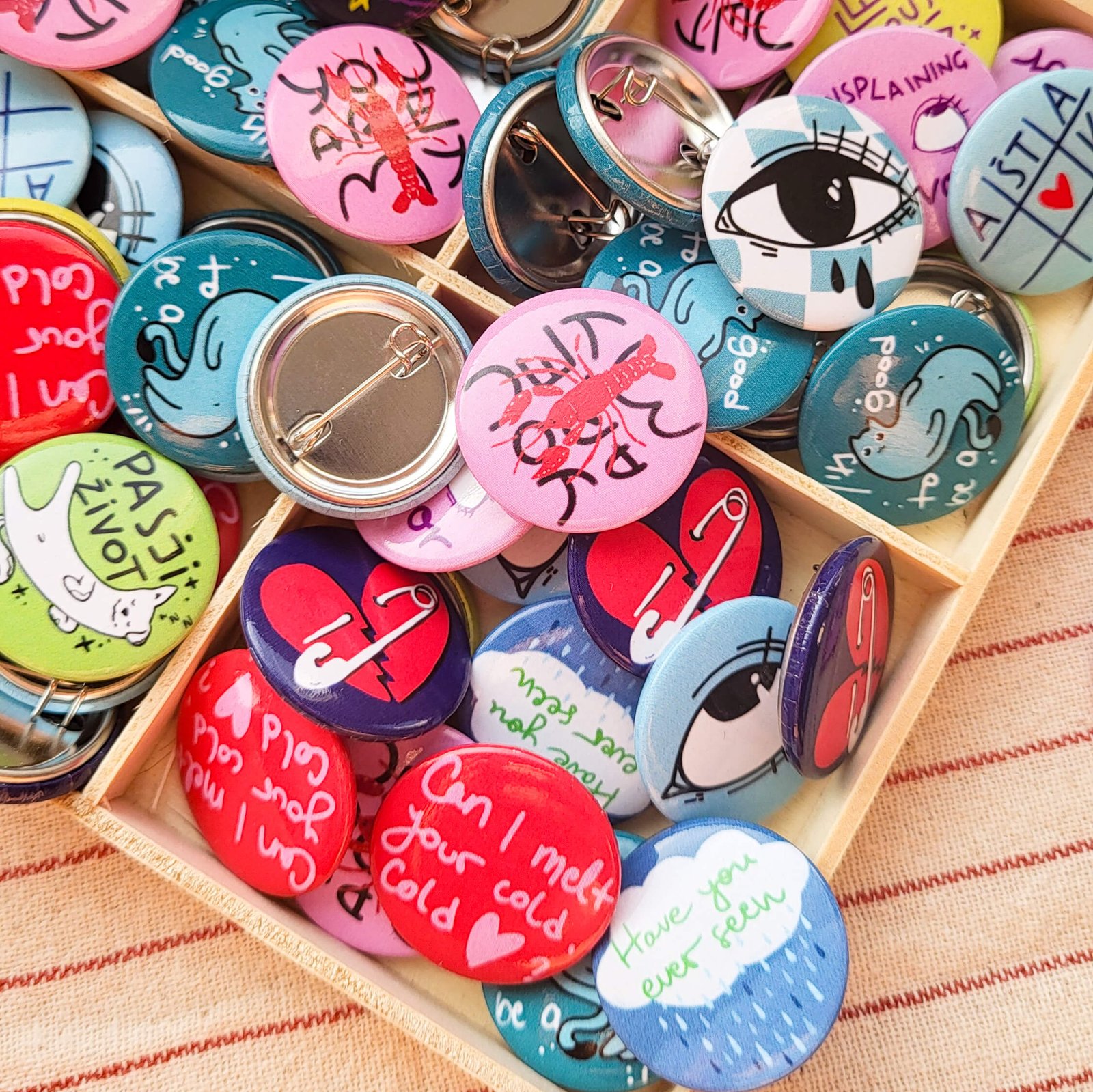 Bedževi imaju sjajni završni sloj, kače se zihericom i prečnika su 26mm. Dolaze upakovani u papir ili kovertu i u zaštitnu poštarsku vrećicu.
